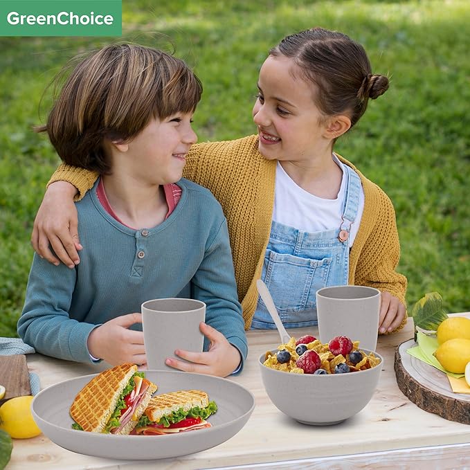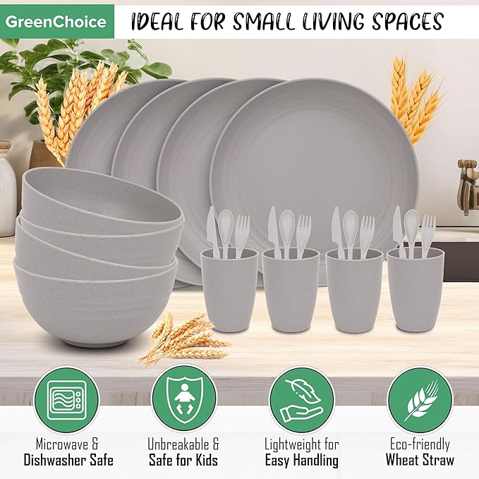 Wheat Straw Dinnerware Sets for 4 - GreenChoice Lightweight & Unbreakable Dishes Microwave & Dishwasher Safe Perfect for Camping, Picnic, RV, Dorm Plates, Cups and Bowls (Gray)