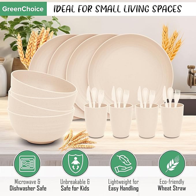 Wheat Straw Dinnerware Sets for 4 - GreenChoice Lightweight & Unbreakable Dishes Microwave & Dishwasher Safe Perfect for Camping, Picnic, RV, Dorm Plates, Cups and Bowls (Beige)