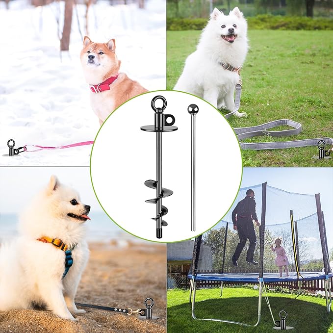 - 【KEEP YOUR DOG SAFE AND FREE】Our dog tie out stake is designed to securely anchor your dog in any ground condition, such as rocky, clay or sandy soils. It has a spiral blade that is welded and tapered to ensure a firm grip on the ground, preventing your dog from pulling it out and roaming around freely and safely