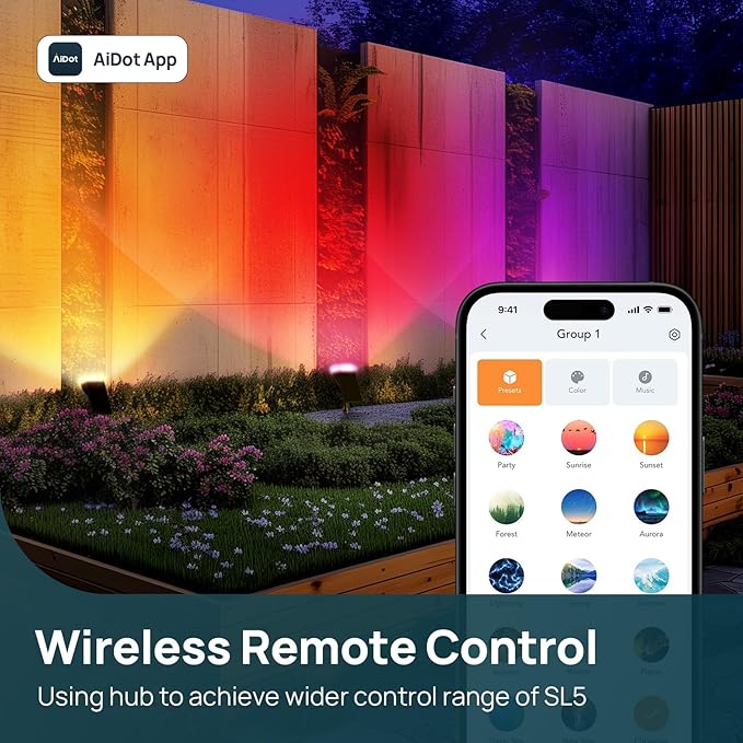 - 【Remote/APP/Voice Control】 Control your solar spotlights outdoor with the AiDot app or connect to Alexa or Google Home for voice control. Customize color, white temperature, brightness, and lighting modes with ease. Experience the convenience of hubless group control, liven up outdoor events with music sync. Besides, the control range of the lights extended from 94ft to 132ft when with a hub.