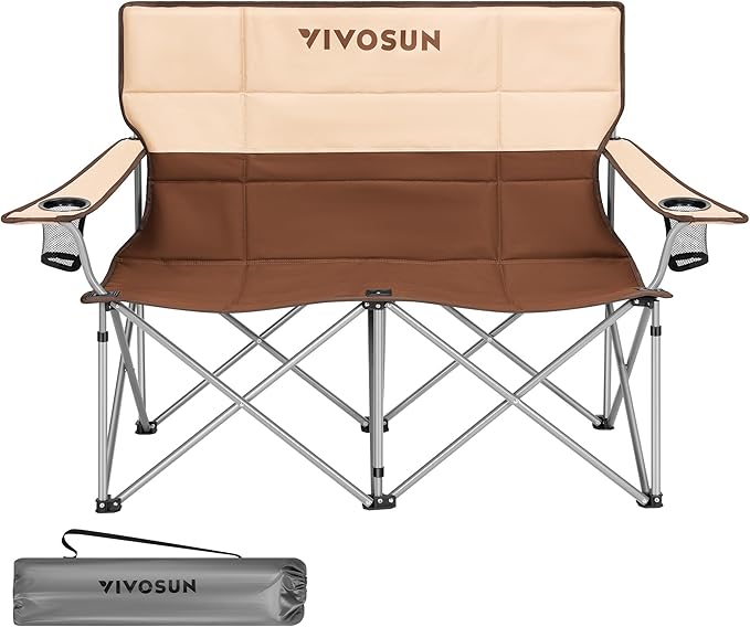 VIVOSUN Double Camping Chair, Fully Padded Folding Loveseat, Portable Oversized Duo Chair with Storage Cup Holders, Height-Adjustable Armrests & Carry Bag, Supports up to 500lbs, Brown & Cream