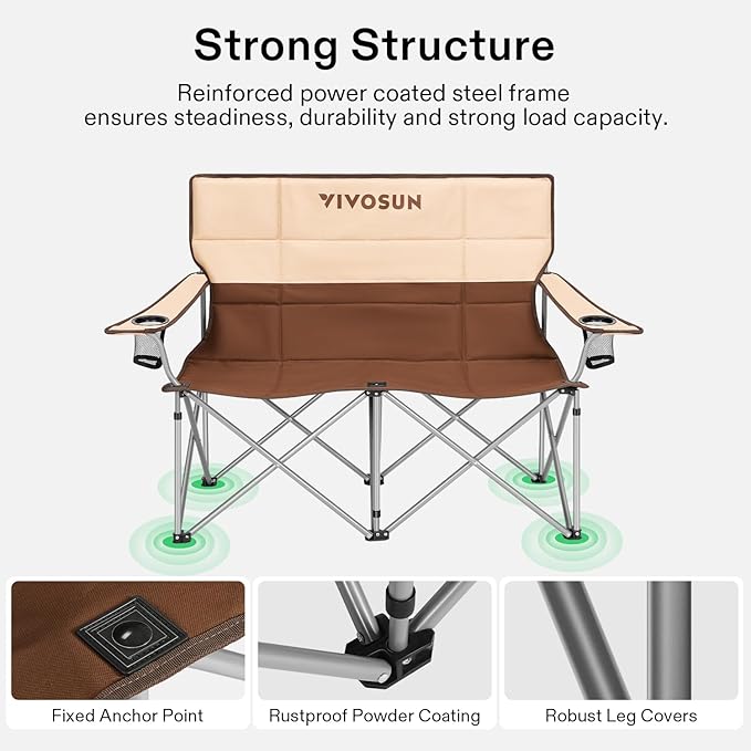 - Height Adjustable Armrests: The height adjustable armrests on this double camping chair ensure proper lumbar and arm support; The ergonomic backrest, full back structure, and large cushion area provide you with better support and superior comfort during extended periods of seating