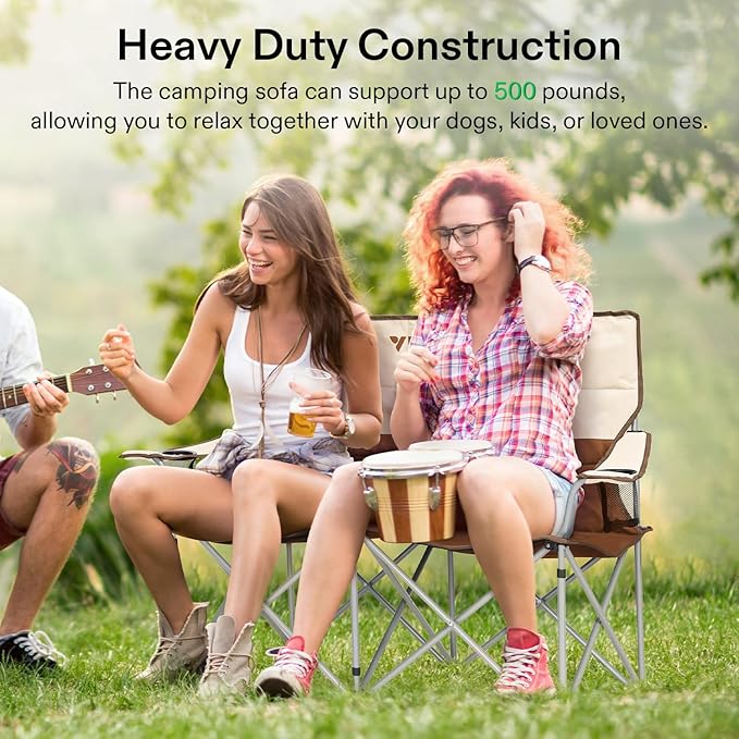 - Heavy Duty & Durable: The camping sofa is constructed with a sturdy powder-coated steel frame and two front bars that can support up to 500 pounds, allowing you to relax together with your dogs, kids, or loved ones; 600D Thick Oxford cloth ensures this portable duo camping chair is waterproof, tear-resistant, and easy to clean