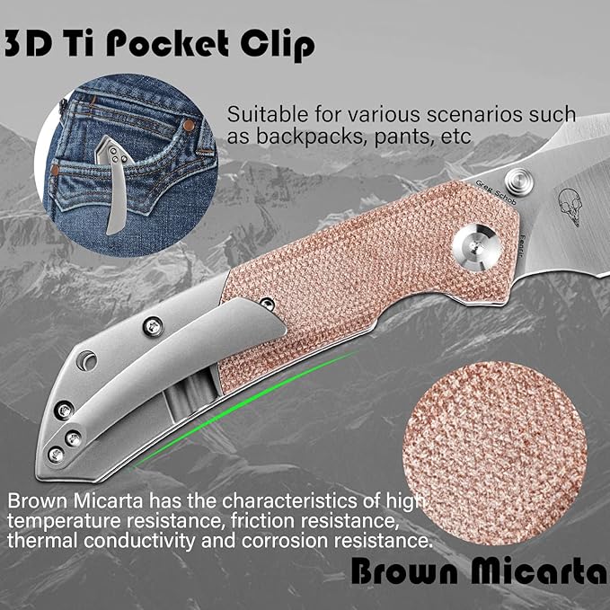 - Ergonomic Handle Grip: Multitool pocket knife with Brown Micarta + Titanium handle is chamfered for secure and comfortable grip.The skeletonized liners help reduce weight without sacrificing structural integrity.