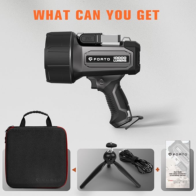 - 【What You Get】The FORTO super bright 10000 lumen spotlight comes with a portable EVA carrying case. Inside, you'll find the 10000 lumen spotlight, a charging cable, a tripod, and an instruction manual. For any pre-sales or after-sales issues or questions, feel free to reach out to us at any time. We are available 24/7, dedicated to providing you with the most satisfactory service.