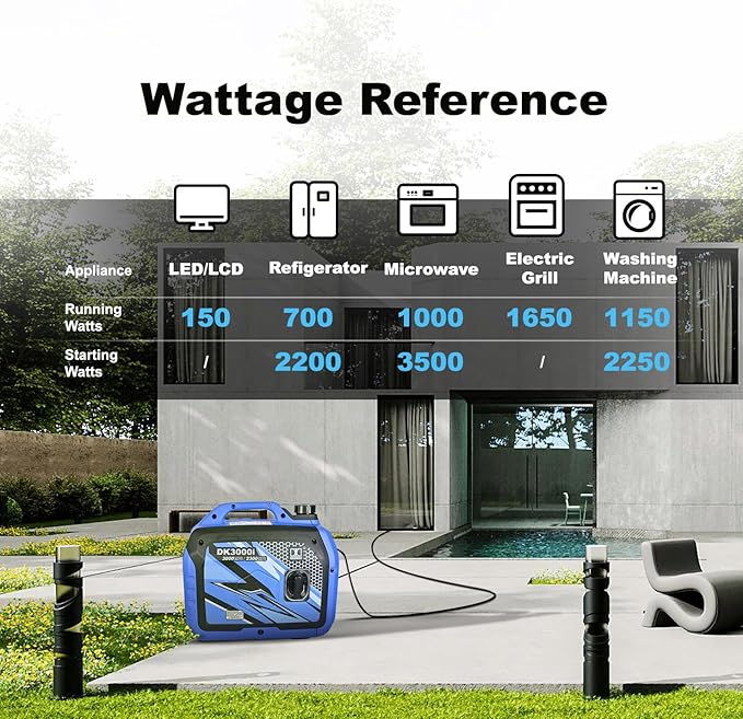 - Preferred 3kw Option:The DK3000i inverter generator produces 3000 peak watts and 2300 starting watts of clean power(THB≤3%), making it ideal for powering delicate electrical gadgets. It is also suitable for tailgating, camping, parties, and yards.