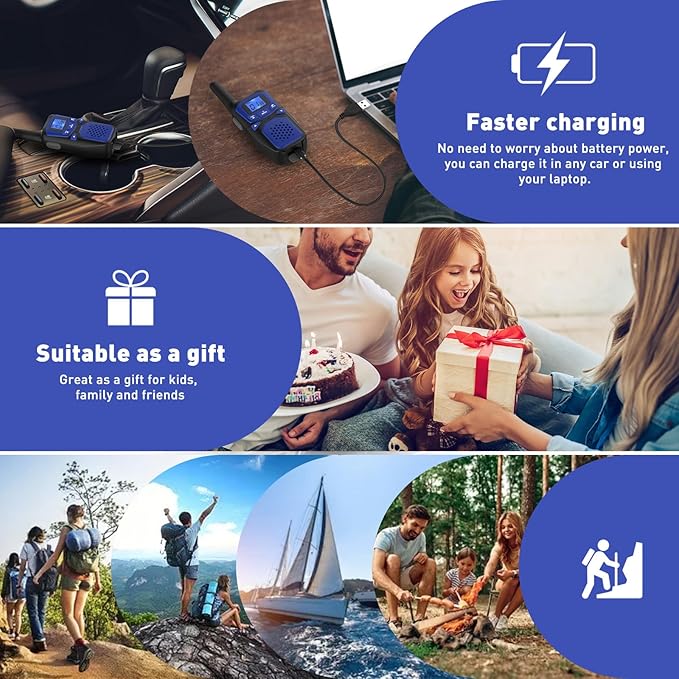 - 【Rechargeable Walkie-Talkies】Powered by 3 AA 1000mah batteries, low battery alert to avoid mid-communication drop-offs and static noise, automatic power-saving to extend battery life and entertainment time. (3x 3 AA 1000mah batteries、3 x Family Walkie Talkies、2 x micro USB charging cable、 3 x new lanyard 、3 x belt clips、1 x User's Manual、1x Exquisite Gift Box).