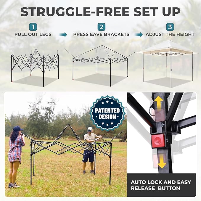 - EASY SETUP CANOPY: Our 10x10 pop up canopy tent features an exclusive patented quick - open frame! Unlike other canopies, there is no need to enter our tent. Just pull down the outside eave bracket, and the canopy expands fully. The smart button pops and locks automatically. Super - stable, and even beginners can set it up quickly within one minute for a cozy outdoor spot