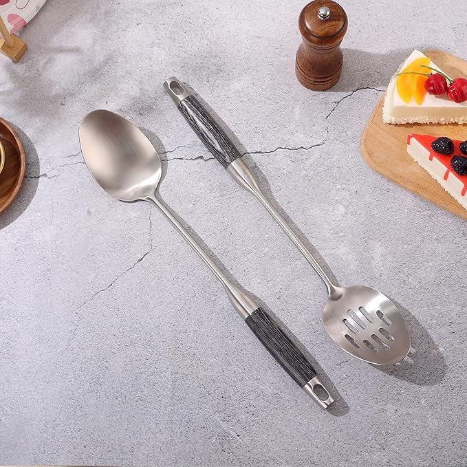 - 【15inch Long Cooking Utensils】: Ergonomic design, idea weight, excellent grip. The unique grain of the ebony handle is exceptionally beautiful, silky to the touch, and offers high heat resistance, the 15-inch length ensures that the chef's hands stay cool during everyday domestic or commercial use