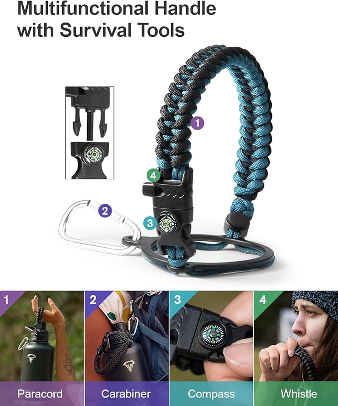 - Ready for adventures: The paracord handle is crafted from sturdy braided rope with an attached survival kit. This includes a compass, a whistle, and a clip, making it an ideal companion for any outdoor activity — be it camping,hiking or exploring new places through travelling.
