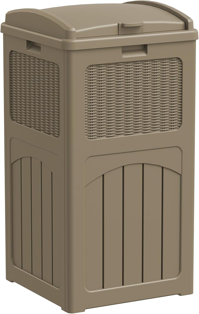 Greesum 33 Gallon Resin Outdoor Trash Can with Lid, Waterproof Resin Garbage Bin for Hideaway, Patio, Deck, Light Brown