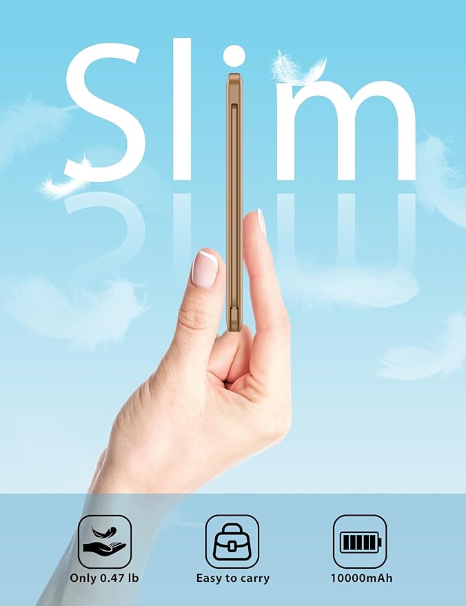 - High Capacity: Contains 10000mAh of power. Enough to provide over 2 entire replacement charge for iPhone 16, for iPhone 15 and Samsung Galaxy S24. 10000mAh can meet your daily electricity demand. And its body is slim, 5.59*2.75*0.57inch like a little phone that you can carry it in your handbag. It will be your most important partner daily. And when you are traveling or on a business trip that will be helpful