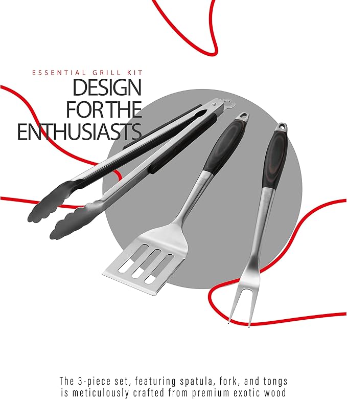 - ๐๐ซ๐๐๐ญ๐๐ ๐๐ข๐ญ๐ก ๐๐ซ๐๐๐ข๐ฌ๐ข๐จ๐ง: our grilling set embodies top-tier quality, boasting meticulous workmanship. It includes a Spatula, Fork & Tongs forged from high-grade stainless steel and hand-polished exotic wood for an exquisite finish.