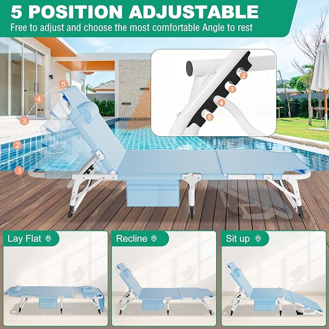 - DESIGNED FOR COMFORT: With a perfect balance of a firm and soft surface, our chaise lounge boasts an ergonomic design to help reduce muscle tension and stress; The beach lounger chair has a side pocket, to place your phone, books or keys; the pillow is detachable, can be adjustable up and down or removed based on your own needs;
