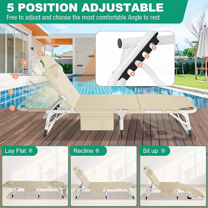 - DESIGNED FOR COMFORT: With a perfect balance of a firm and soft surface, our chaise lounge boasts an ergonomic design to help reduce muscle tension and stress; The beach lounger chair has a side pocket, to place your phone, books or keys; the pillow is detachable, can be adjustable up and down or removed based on your own needs;