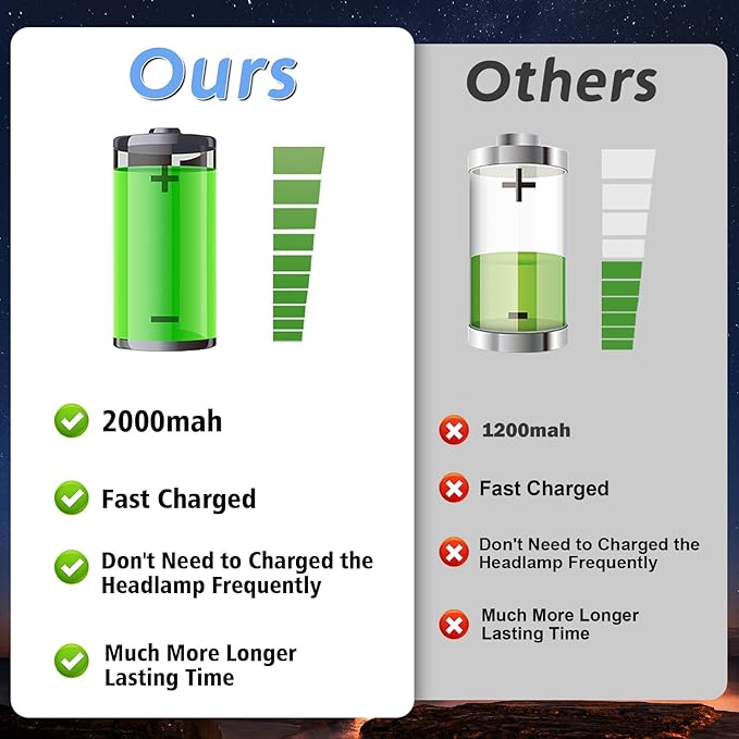- 【Long Lasting Power Led Head Lamps & USB-C Fast Charging】built in 2000mAh rechargeable battery making our rechargeable headlamp has a much more long lasting time than other headlamps.Type-C USB input port,you can charge this headlamp with your computer,power bank,and car charger even though your are not at home,very convenient !
