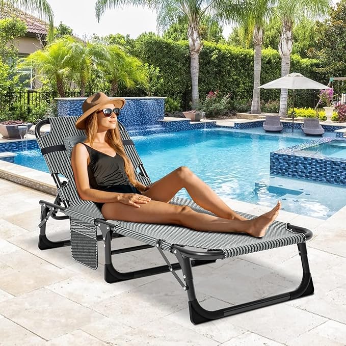 - 5-POSITION LOUNGE CHAIR:The chaise lounge chairs uses a triangle locking system to lock the chair in different positions, you can sit up, recline or lay flat. Meet your requirements in different scenarios