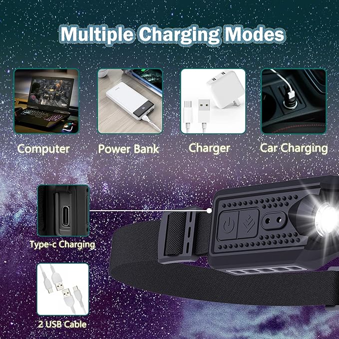 - 【Rechargeable & Ultra-Long Standby】Equipped with a 1200 high-capacity lithium polymer battery, LED headlamp rechargeable can be used for 2-8 hours in different light modes, and can be fully charged in 2.5 hours by the USB-Type C charging cable.Plus, the waterproof and dustproof design is enhanced by an anti-dust cap.