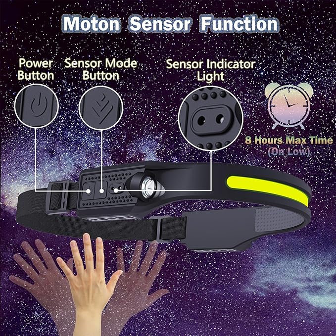 - 【6 Light Modes & Motion Sensing】 Head lamps have 6 working modes, including COB high mode, COB low mode, XPE high mode, XPE low mode, strobe mode and motion sensor mode to meet all scenarios, 3-second press of the power button to transform the strobe mode. The first 5 modes of headlights can be used in conjunction with motion sensors mode. Press the motion sensor button, then you can turn the head flashlight on or off with a wave of your hand.