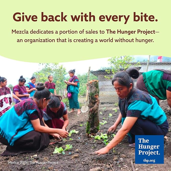 - EACH BAR GIVES BACK: Mezcla is dedicated to making a positive impact in communities around the world. Partnering with The Hunger Project, a global non-profit committed to ending world hunger by 2030, Mezcla donates a proceed of bar sales to support their efforts.