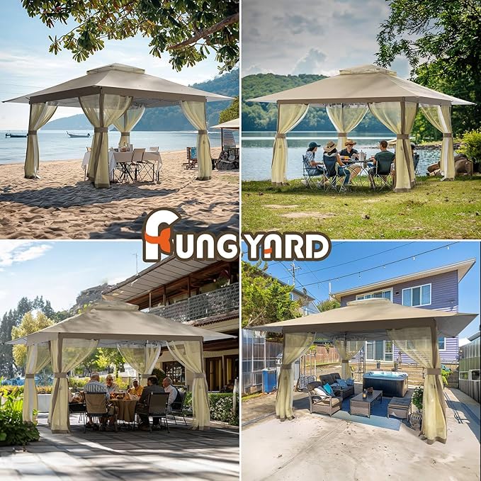 13x13 Outdoor Patio Gazebo with Mosquito Nettings - Double Roof Pop Up Canopy Tent with Wheeled Carry Bag, for Backyard Deck Lawns Garden (Beige, 13x13)