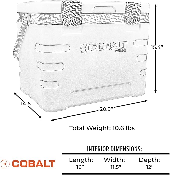 • 37 Quart Cobalt Cooler Product Dimensions: External Dimensions: 20.9 x 14.6 x 15.4 Inches. Internal Cooler Department Dimensions: 16 x 11.5 x 12 inches. Weight 11.6 lbs.