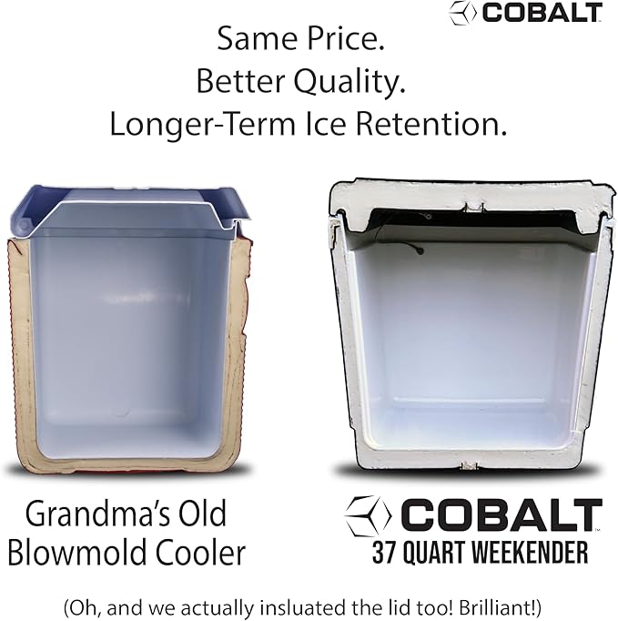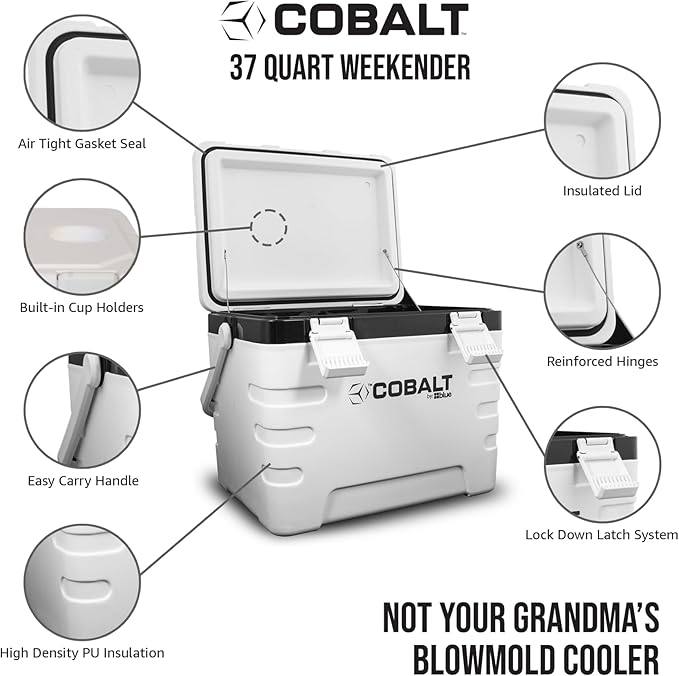 - Our Cobalt line of coolers are rated for Long Lasting Ice Retention but are nearly 20% lighter weight than traditional roto-molded coolers.This 37 Quart Blow Molded construction ensures that each cooler is rugged and durable, has a consistent wall thickness, and is free of imperfections. It's the perfect gift for men!