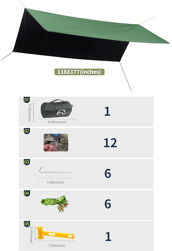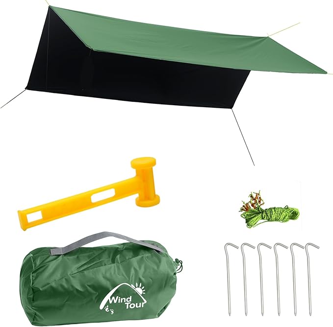 - WATERPROOF & UV PROTECTION - Tarp tent made of 190T ripstop polyester fabric with 3000 PU waterproof and black glue coating. Not only is it a good shelter on rainy days, it can also block ultraviolet rays well on sunny days to prevent the skin from being exposed to the sun.