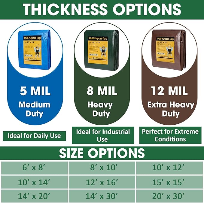 - Multi-Purpose Application: Great for construction sites, medium-duty truck covers, or outdoor furniture protection. Sizes range from 6x8 to 20x30 feet