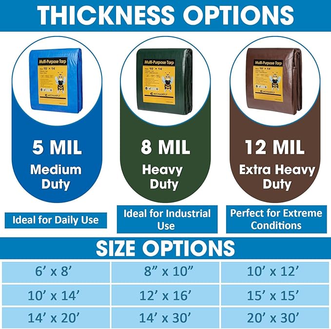 - Versatility in Use: Suitable for covering bikes, garden tools, or as a picnic mat. Available in multiple sizes, from 6x8 feet to 20x30 feet