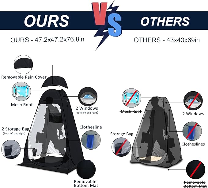 - POP UP DESIGN & SOLID & PRIVACY - Anchoring security and privacy is a must when you are using the outdoor shower tent for camping. Pops up and folds down in seconds, no assembly required. Besides, equipped with tent pegs and 4 guy lines to make sure your tent shower is secure. Also includes 4 tent nails and pull cords sandbags weigh your tent down even in harsh terrain and windy days. Thickened Oxford cloth has weaker light transmittance, increasing the privacy of your shower.