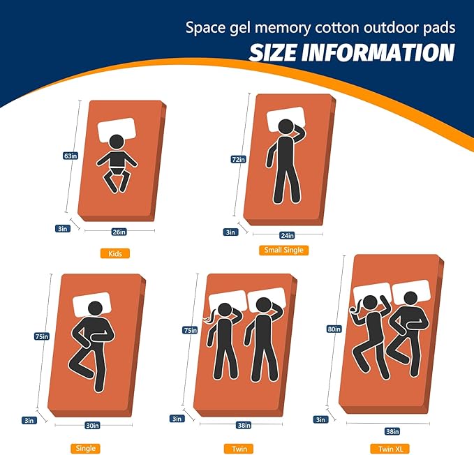 - 【MULTI-SIZE OPTIONAL & AFTER-SALES SERVICE WITHIN 24 HOURS】 5 sizes for you to choose from camping mattress full size, kids (63x26x3") small single (72x24x3”) single (75x30x3”) twin (75x38x3”) twin xl size (80x38x3”), Be sure to choose the most suitable size. Since we shipped by vacuum compression packaging, please Open the package and place it for about 24-48hours. If you have any question, feel free to contact us. Please believe that we will solve the problem for you within 24 hours.