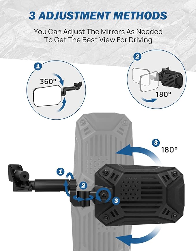 - 【Customizable Views】The Wrangler JL mirrors offer three methods of adjustment - 180 degrees up and down, 180 degrees front and back, or 360 degrees rotation. You can position the Gladiator doors off mirrors either horizontally or vertically. By adjusting the Wrangler side mirrors with doors off, you can get a clear and distortion-free view, which can enhance your driving experience