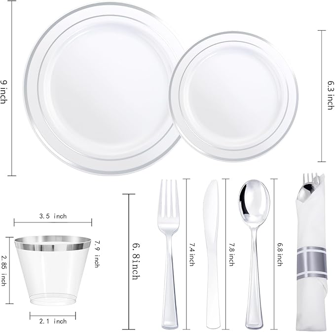 - COMPLETE SET FOR 50 GUESTS: This white and silver plastic plates set includes 50pieces 6.3” dessert plates, 50pieces 9” dinner plates, 50 silver forks, 50 silver knives, and 50 silver spoons, all individually wrapped in 50 silver napkins, known as roll-up napkins. Additionally, there are 50 clear white cups with silver rim, packaged in a white box. These white plates can provide everything you need for up to 50 guests.