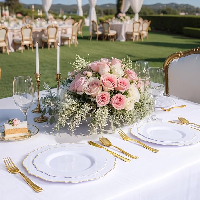 - PREMIUM QUALITY :Include 60pcs 10.25” white and gold plastic plates, WDF heavy duty gold disposable plates can hold any foods. Made of disposable and reusable plastic that is sturdy and durable.