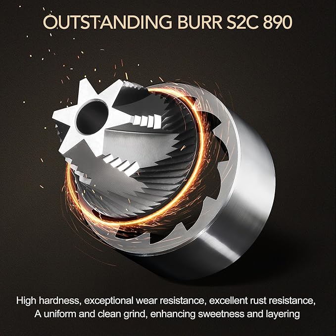 - PREMIUM STAINLESS STEEL BURR: Engineered with the original S2C 890 stainless steel burr, our coffee bean grinder ensures durability and consistency in every grind. Experience superior performance and longevity for your coffee grinding needs.