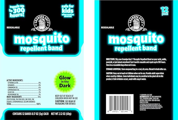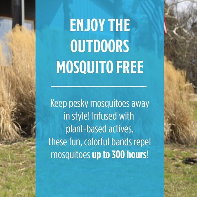 - A pack of 24 mosquito repellent bands of assorted colors that glow in the dark. Offering up to 300 hours of protection per band, to keep mosquitoes away from you and your family