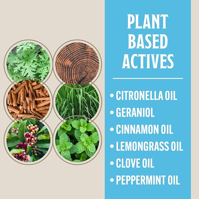 - Infused with plant-based active ingredients such as Citronella Oil, Geraniol, Cinnamon Oil, Lemongrass Oil, Clove Oil, and Peppermint Oil