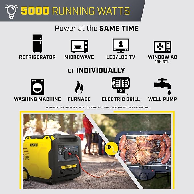 - 6500 starting watts, 5000 running watts, and ultra-quiet 64 dB(A) operation make it perfect for camping, RVs, or backup power, with up to 15 hours run time on a full tank.