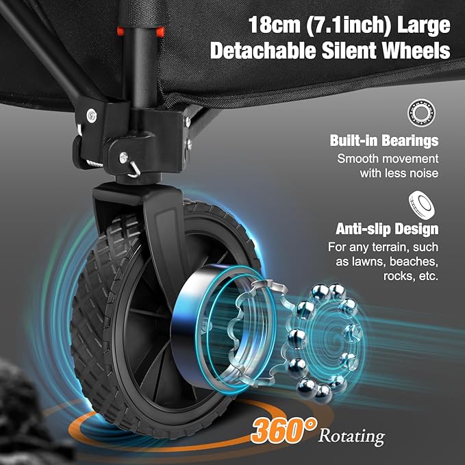 - ALL-TERRAIN WHEELS: Features 7-inch large wheels, the two 360° swivel front wheels help you effortlessly maneuver the direction of foldable wagons carts. The built-in dual-bearing design ensures smoother steering and dragging. The big wheels are more suited for all-terrain surfaces like beaches, grass, rocky areas, and pathways.