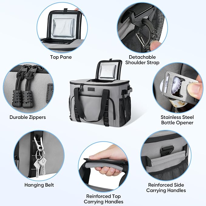 - [COLLAPSIBLE DESIGN] Don't let a bulky cooler limit your space! Our soft-sided insulated cooler bag is collapsible for easy storage when not in use. Simply fold it down to a compact size, making it perfect for small car trunks and saving space at home.