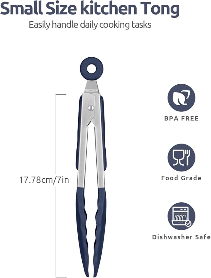 600ºF Heat Proof Kitchen Tong: U-Taste 7" Silicone Cooking Tong with Firm Sealed Non Stick Rubber Tips & Silicon Coated 18/8 Stainless Steel Handle & Smooth Locking for Serving Salad (Midnight Blue)
