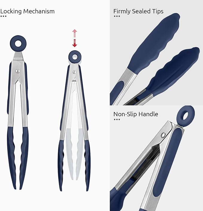 - [Dishwasher Safe & Easy to Store] After you grilling, bbq, mixing salad, frying meat/steak, serving hot dog, the food will not stick to the tongs so you can use a quick wipe and rinse it with hot soapy water or just throw them in the dishwasher. You can close them and store in your drawers to save space, or you can hang them up for easy access. These heavy duty tong utensils with multiple colors available to match your kitchen style or other accessories series.