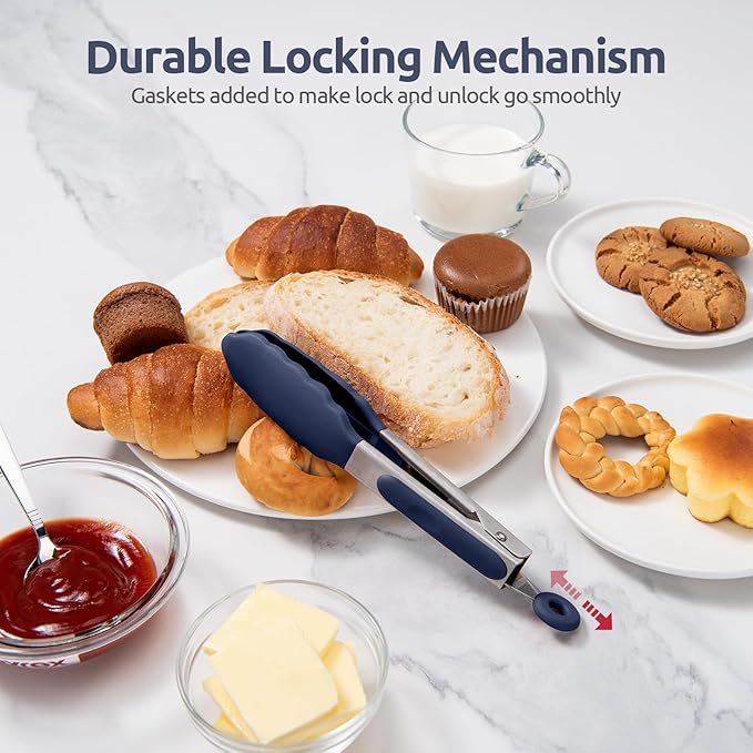 - [Easy & Ergonomic Locking Mechanism] The upgraded food serving tong has a smooth locking mechanism. With the added gaskets, you can easily lock and unlock the tongs. With more and larger 18/10 stainless steel springs, it achieves a perfect balance between too tight to open and too loosen to grasp food. Simply hold the open tongs closed, pull the tab out to lock them closed and push the tab in to re-open for grabbing food. The pin holds two parts of the tong is tightly, no breaking issues.