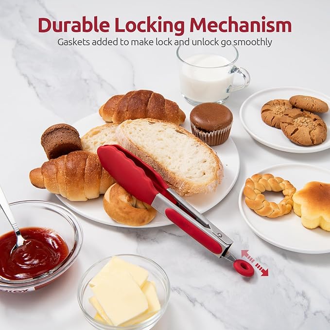 - [Easy & Ergonomic Locking Mechanism] The upgraded food serving tong has a smooth locking mechanism. With the added gaskets, you can easily lock and unlock the tongs. With more and larger 18/10 stainless steel springs, it achieves a perfect balance between too tight to open and too loosen to grasp food. Simply hold the open tongs closed, pull the tab out to lock them closed and push the tab in to re-open for grabbing food. The pin holds two parts of the tong is tightly, no breaking issues.