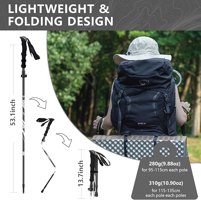- 【Folding Design】 Hiking poles provids telescopic and foldable tri-fold design. You can freely adjust the lenght from 43" to 53" to fit your height comfortably after easy installing. What's more, they can folding down less than 13.7" to store in your backpack, luggage, or duffel bags.