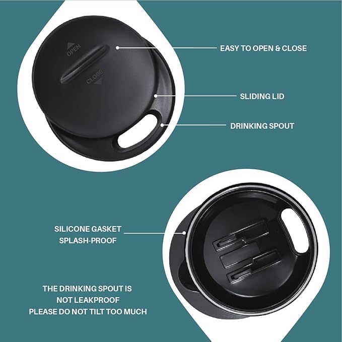 - 【PRESS-IN LID】- Silica gasket seals to achieve maximum spillproof capability. Drinking hole on the top, with a splash-proof sliding cover. Please note it is to keep drinks contained and prevent heat/cold from escaping. It is not leakproof.