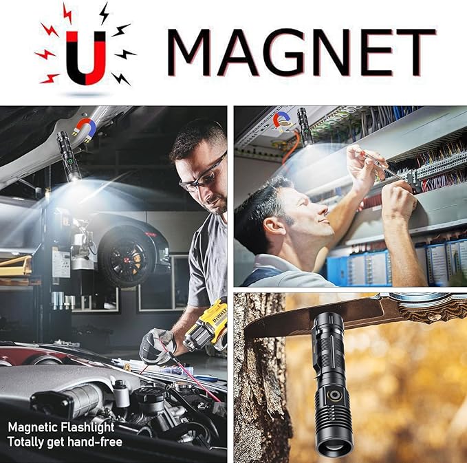 - Magnetic Flashlight, Zoomable : Small Rechargeable Flashlight with Powerful Magnet base, allow you fix this led flashlight on any metal surface to really free your hands; With Zoomable function, it can work as a spotlight when zoom out , and also can be used as a floodlight when zoom in.suitable for outdoor survival activity such as camping hiking travel,nigh walking or other emergency situations