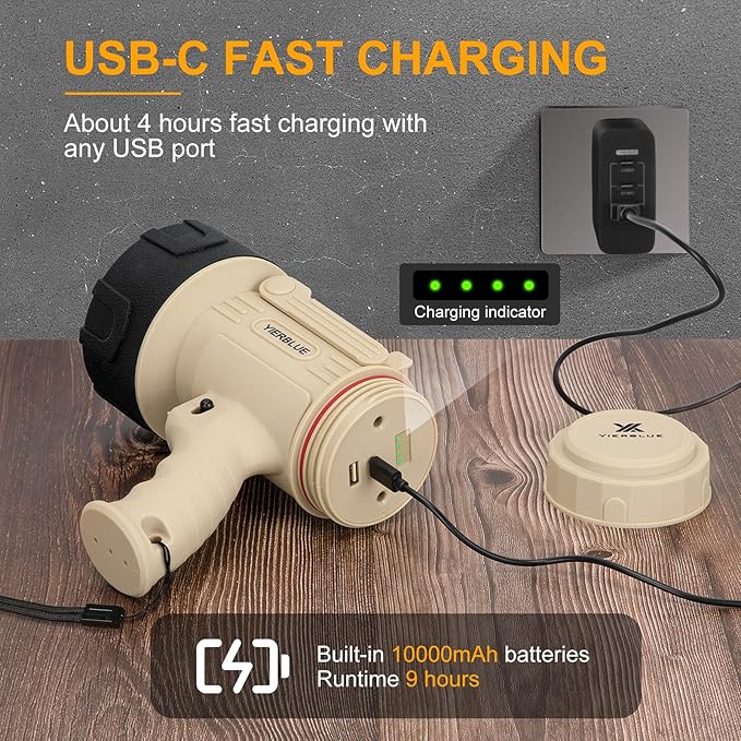 - LONG TIME LIGHTING & POWER BANK: Built-in rechargeable batteries, YIERBLUE’s proprietary battery technology give you up to 9 hours lighting on lower settings, 3 hours lighting on higher settings. An output port built into the spot light can be used as a power bank to charge your devices in emergency.