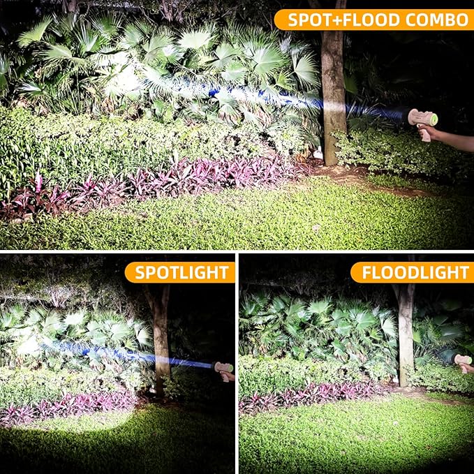 - SPOT FLOOD COMBO LIGHT: This extra bright LED spotlight + COB Floodlight casts a 2000 high lumen beam out to an incredible 550 yards and a wide view. The COB floodlight compensates for the narrow beam of the spotlight, can be used alone as a work light. LEDs boast an extended 50000-hour lifespan. Features 6 adaptable settings: Spot+Flood / Spot High / Spot Low / Flood High / Flood Low / SOS(Long press 3 seconds).